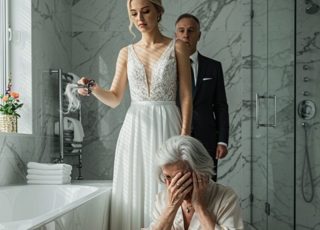 On the wedding morning, i opened the bathroom door and saw my wife frozen before the mirror, her silver hair cut away—while my daughter-in-law laughed on camera, calling it a “prank.” i stayed silent until the consequences came… and she began to tremble…