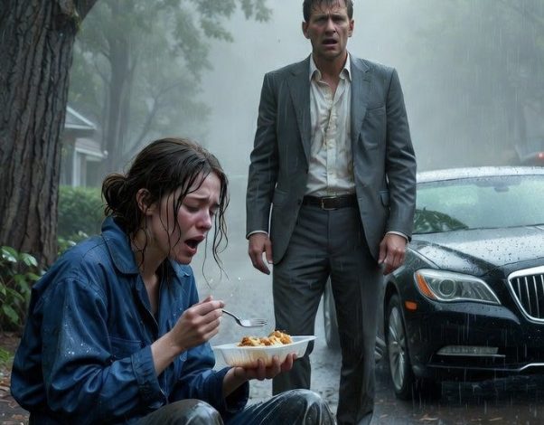 In front of an immense mansion, framed by neatly trimmed hedges and marble fountains, a woman in a faded blue uniform sat beneath a tree, her hair plastered to her face and her hands trembling as she tried to eat from a cheap plastic lunchbox. The rain fell harder, mingling with her tears. And yet, she didn’t move, didn’t seek shelter. Her food was getting soggy, her clothes clung to her body, and her small figure shivered with cold and exhaustion. She looked like someone who had forgotten what comfort was.