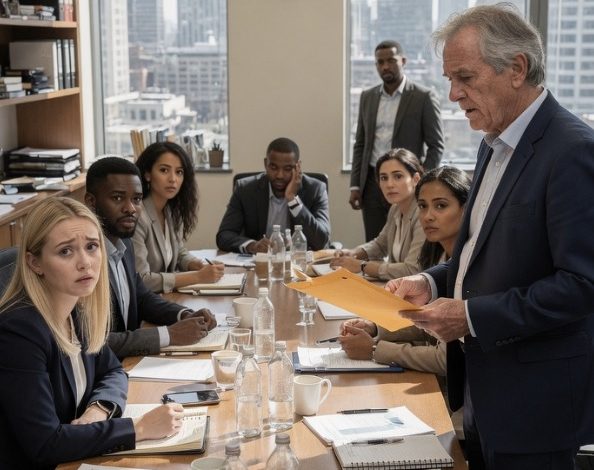 Alan Mitchell stood by a side table, organizing folders. His assistant was pouring water into glasses nobody would drink. And in the far corner of the room, sitting perfectly still, holding a brown leather envelope, was a man I had never seen before. Silver hair, gold-rimmed glasses, a dark suit that fit like it was sewn for him. He didn’t introduce himself. He didn’t smile. He just sat there watching.