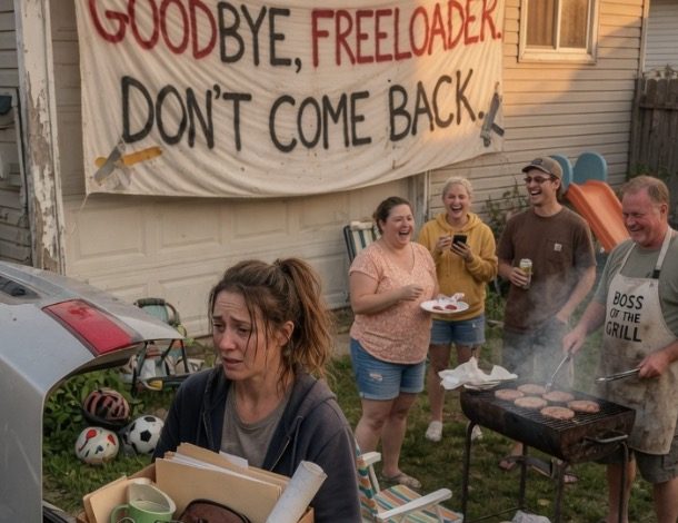 The day my father decided to celebrate throwing me out of his house, he did it with the theatricality of a stadium ribbon-cutting. I pulled into the gravel driveway of my childhood home to retrieve my final banker’s box of files and found a grotesque festival in progress. A massive vinyl banner, at least twelve feet long, was stretched across the garage door in aggressive crimson block letters: GOODBYE, FREELOADER. DON’T COME BACK.