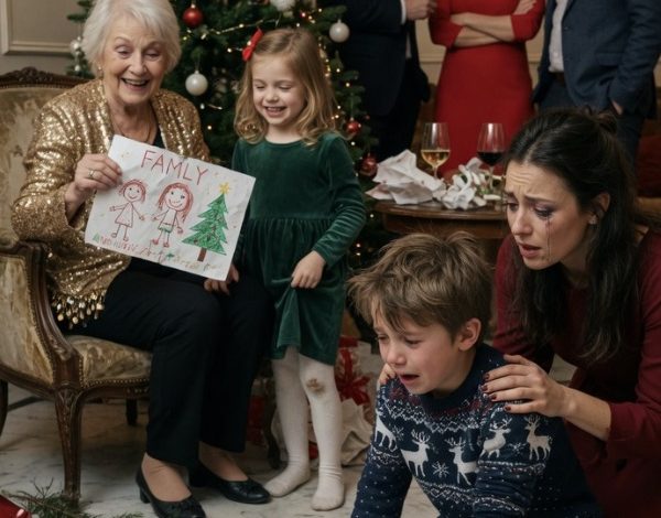 Tiny glass fragments flew out in a glittering circle around my son’s shoes. They caught the white Christmas lights from my mother’s tree and flashed like cruel confetti at the exact moment Liam bent down on instinct, both hands reaching for the broken pieces before anyone else could step on them. He was eight years old and already had the reflexes of a child who expected the things he loved to be damaged in front of him.